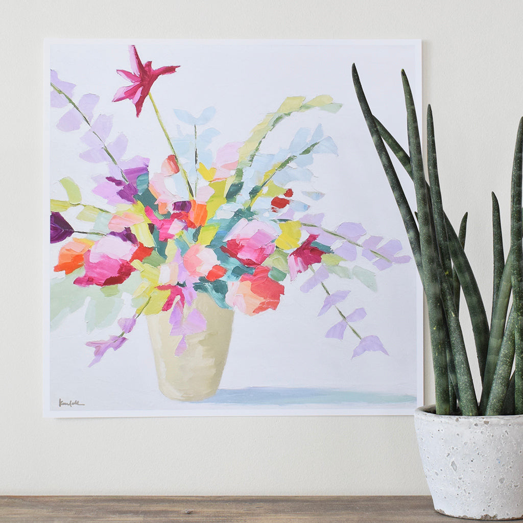 Kendall Kirk Singleton has been painting ever since she could hold a paint brush, and art was always her favorite subject growing up. She officially started her creative business during her senior year of college and graduated from Mississippi State University in May of 2015. Although born and raised in Jackson, Mississippi, she now lives in Hattiesburg, Mississippi with her husband and opened her studio there at the beginning of 2018. Kendall works with a palette knife and oil paints for her subjects and always incorporates beautiful, bright color combinations. This wisteria print measures 16"x16".