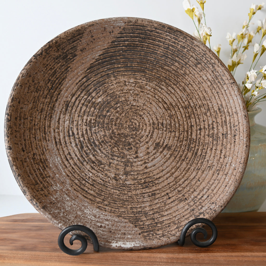 The rich earth tones of the Mississippi Delta are captured in the glazes and textures of this pottery, crafted with care by the Woods Brothers of Mound Bayou, MS. This piece measures 16 inches in diameter.