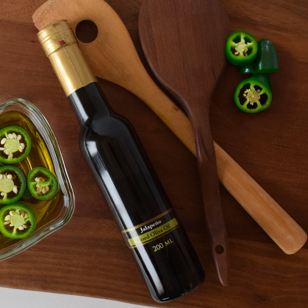 This spicy Jalapeño-infused olive oil is produced by blending freshly picked Frantoio olives with a generous amount of Jalapeño peppers. The mixture is then crushed and combined in a malaxer, resulting in a unique combination of the peppers' essential oils and the rich olive oil. The resulting product boasts a lingering spiciness, subtle bitterness, and a vibrant capsaicin kick. It adds a tantalizing touch to salsas, marinades, soups, grilled dishes, and vegetables. Caution: it packs some heat! 200mL