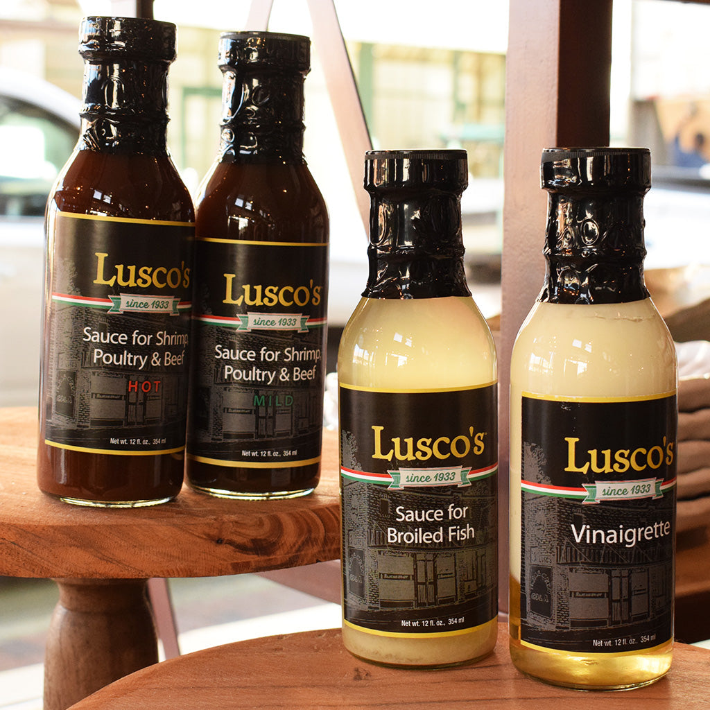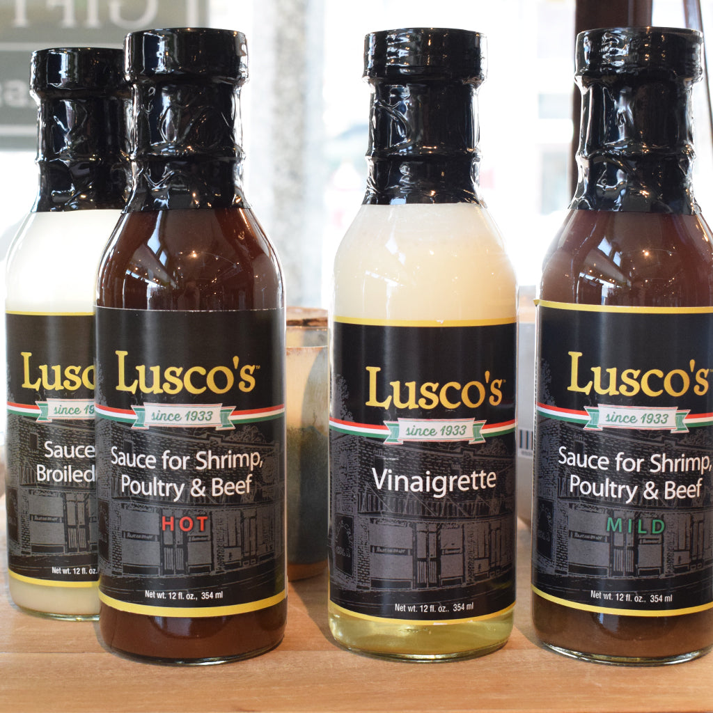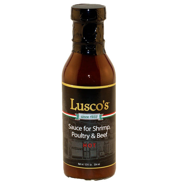 This sauce is the sauce that has made Lusco’s “Broiled Shrimp” a favorite for the last 88 years. It is spicy and the kind of sauce you want to sop up with bread. It is a Worcestershire based sauce that is meant to be added to your broiled or sautéed shrimp after cooking. This product is classified as hot because it has a little more spice to it than the mild. 12 oz. glass bottle.