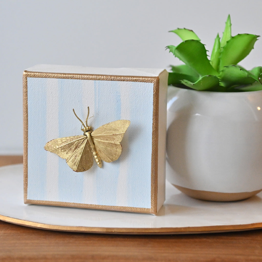 Add a touch of elegance to your wall with our Butterfly Canvas. The 3-D gold butterfly stands out against the blue and white canvas, measuring 4"x 4". Perfect for any room, this canvas adds a pop of color and texture to your decor.