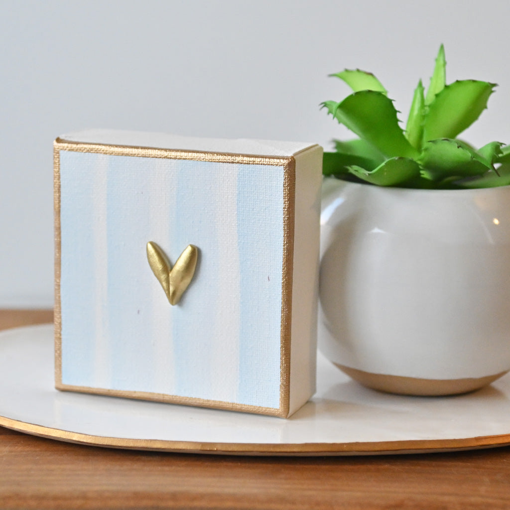 A charming 4x4 canvas featuring pale blue stripes with a 3D heart. This delicate piece brings a soft, romantic touch to any room, perfect for adding warmth to shelves, desks, or gallery walls. The subtle color palette complements a variety of décor styles, making it an ideal gift for those who appreciate understated elegance and handcrafted details.