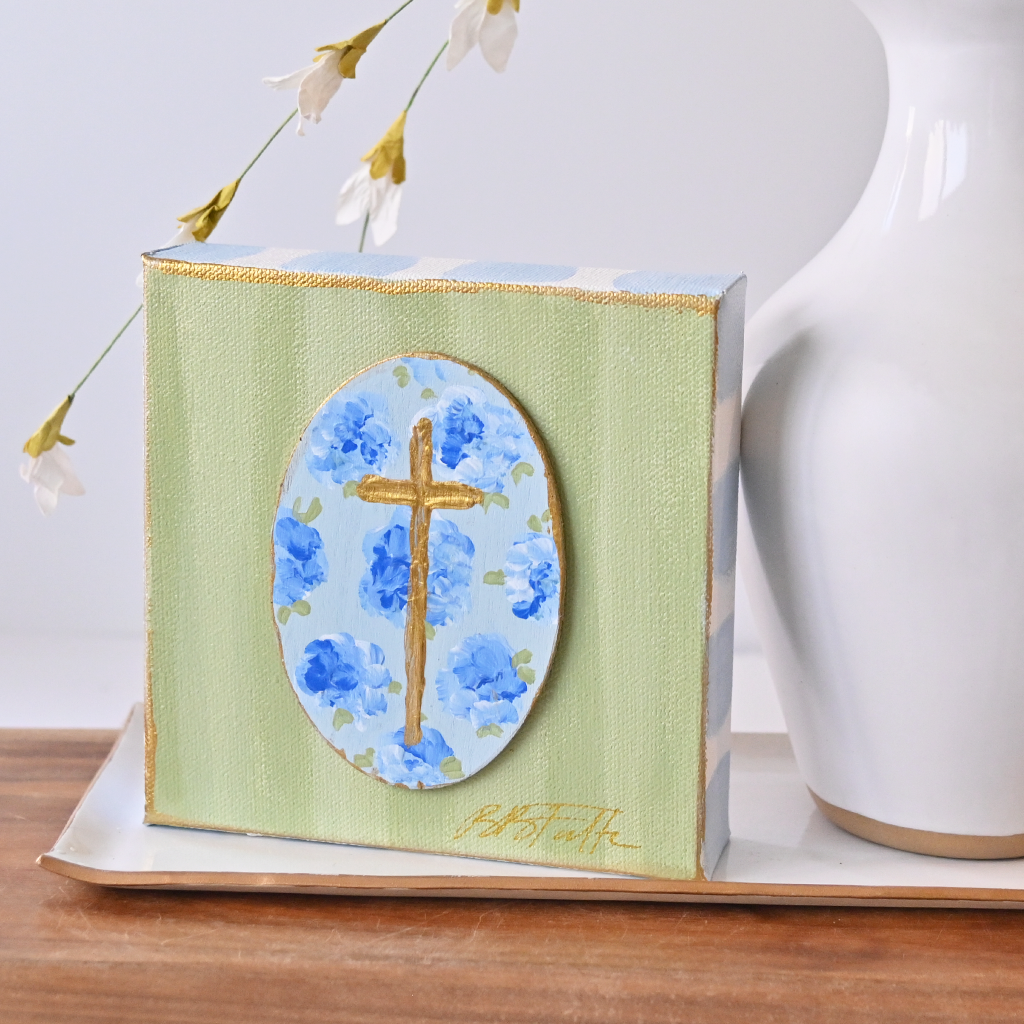 Bring the beauty of spring into your home with our hand painted Green Intaglio Cross Canvas! Measuring 6" x 6", this vibrant piece adds a touch of nature and color to any room. Invigorate your space and inspire your senses with its delicate floral design.