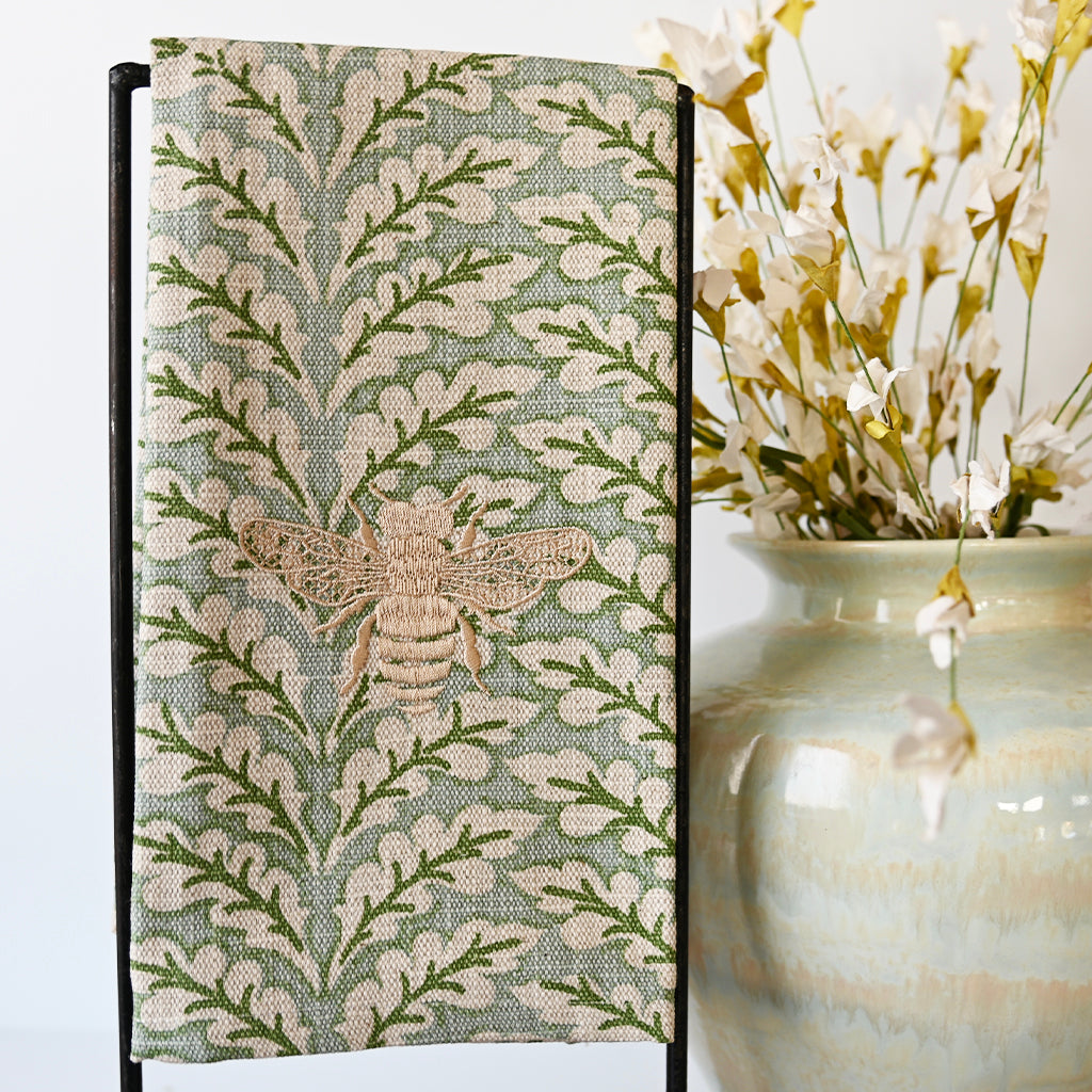 Enhance your bathroom with this Green Pattern Bee Hand Towel. Featuring a gold embroidered bee on a gorgeous green pattern, this hand towel adds a touch of elegance and style to any space. Made with soft and absorbent materials, it provides both functionality and beauty.