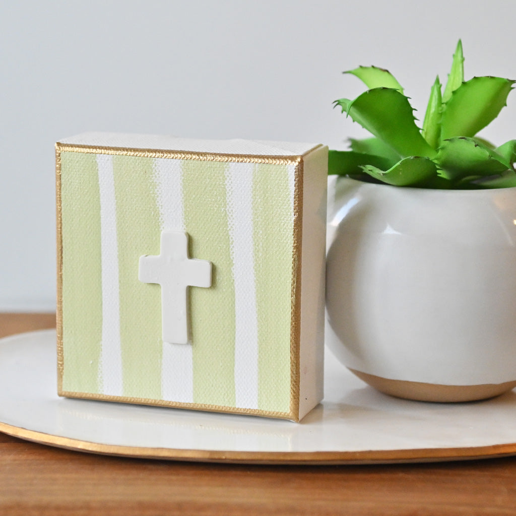 A striking 4x4 canvas featuring a pastel green striped cross design. Perfect for adding a pop of color and spiritual symbolism to any room. The classic cross motif combined with vibrant green stripes creates a modern, eye-catching piece that complements both contemporary and traditional décor. Ideal for bedrooms, living spaces, or as a meaningful gift for those seeking faith-inspired wall art.
