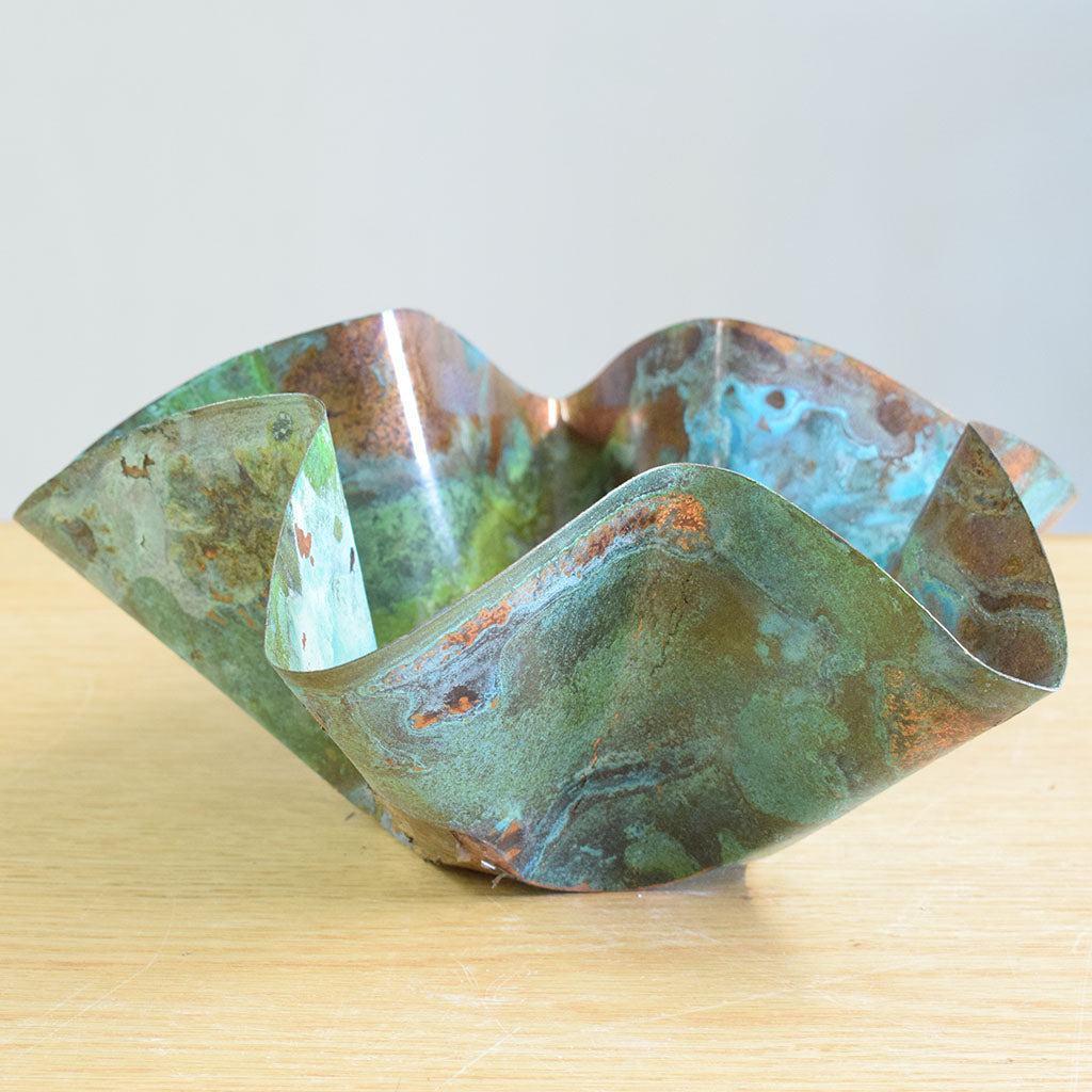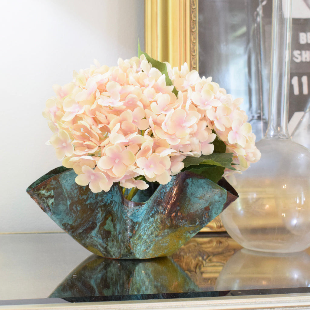 This copper flower pot is a beautiful piece for the garden, patio, or even the living room. This flower pot is 10"x 8" and is 4" deep and can hold three small pots or one large mass of soil and flowers. Available in three classic finishes.