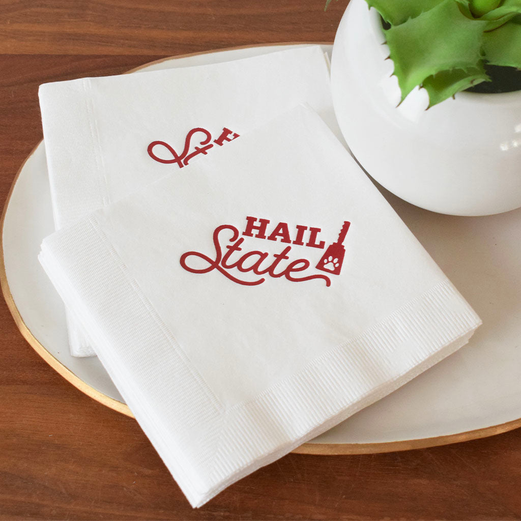 Get ready to show off your team spirit at your next tailgate with Hail State Cowbell Beverage Napkins! With a vibrant cowbell design and "Hail State" written boldly, these napkins are perfect for any game day celebration. Don't worry about spills, these beverage napkins have got you covered. Go State!
