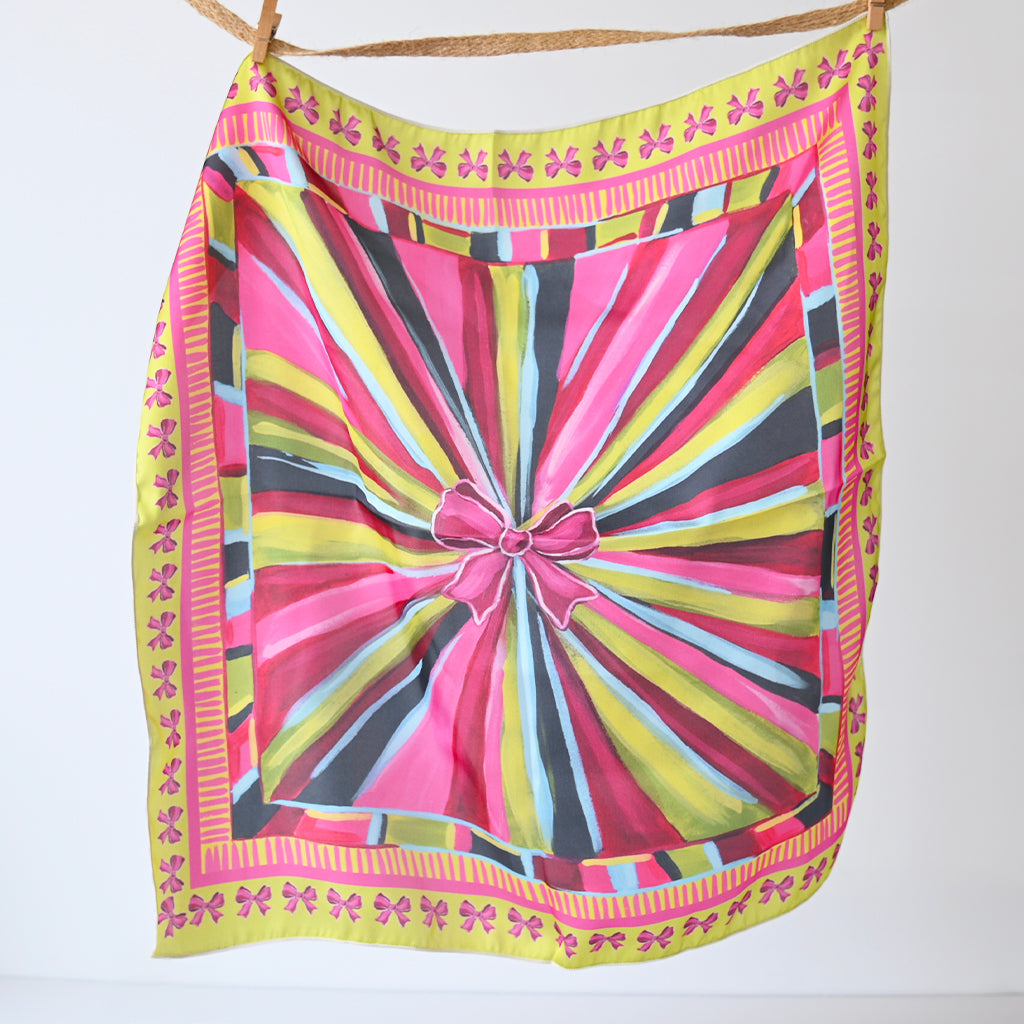 Add a pop of playful elegance to any outfit with this vibrant 16"x16" scarf adorned with charming bows! The colorful design makes it perfect for jazzing up a simple look or adding that extra touch of whimsy. Small but mighty, this adorable accessory brings big personality to your style game!