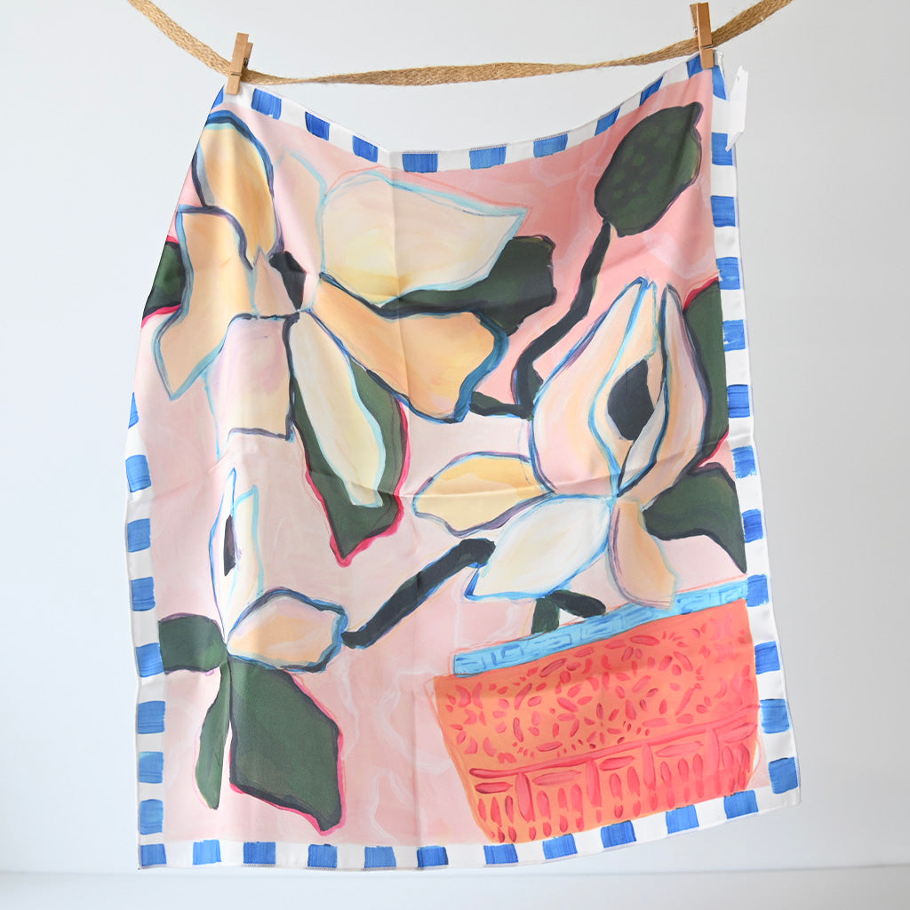 Tap into your inner "Steel Magnolia" with this charming 16"x16" scarf! Adorned with vibrant multicolored magnolias, this versatile accessory adds a playful pop to any outfit. Tie it around your neck, wrist, purse, or hair for that perfect touch of Mississippi flair wherever you go!