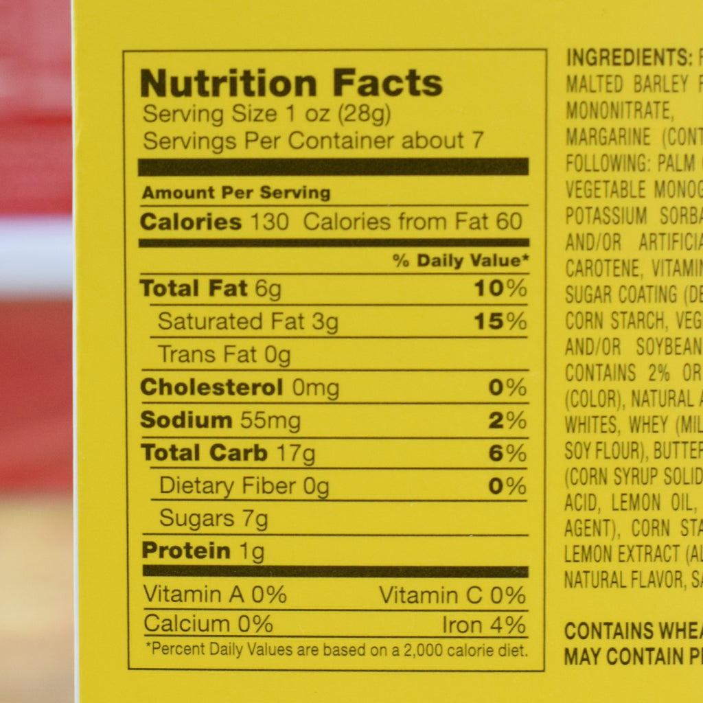 Ingredients: Flour, Margarine, Water, Salt, Natural and Artificial Flavor, Citric Acid, Beta Carotene, Vitamin A, Sugar, Sugar Coating, Lemon Juice Solids, Lemon Flavor, Lemon Oil, Corn Starch, Natural Lemon Extract, Ascorbic Acid