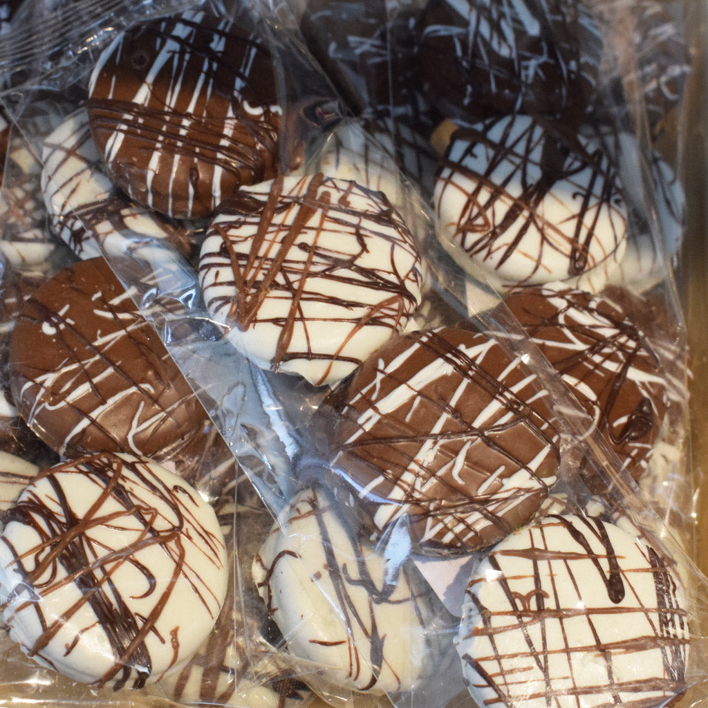 Oreos hand dipped with white chocolate and milk chocolate drizzled with more chocolate for a festive snack. Makes a great addition to a basket!