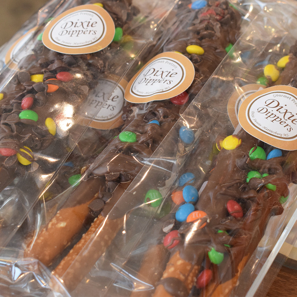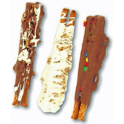 Pretzel sticks dipped in delicious creamy chocolate, and mini M and Ms. A favorite to add to any basket!