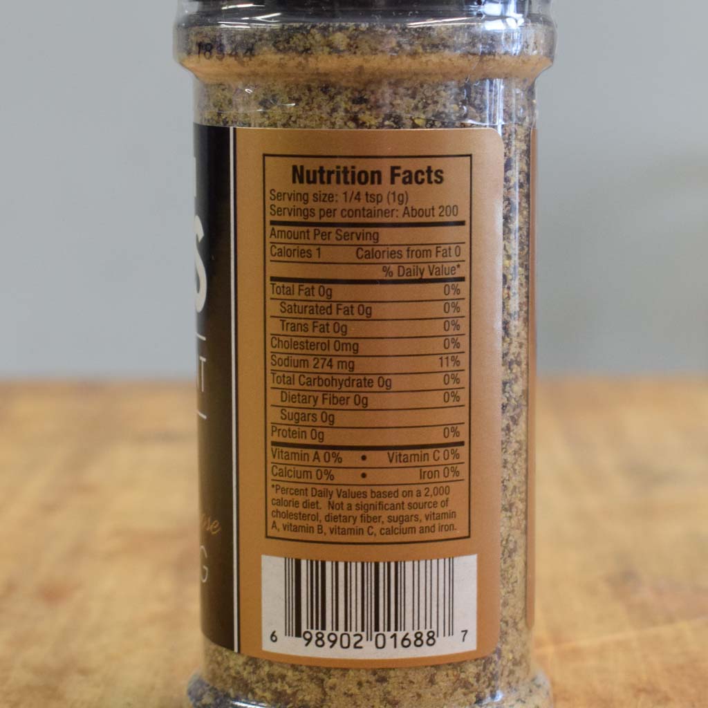 Ingredients: Salt, Spices, Dehydrated Garlic, Canola Oil, Disodium Inosinate and Guanylate Caramel Color, Spice Extractive, Anti Caking Agent.