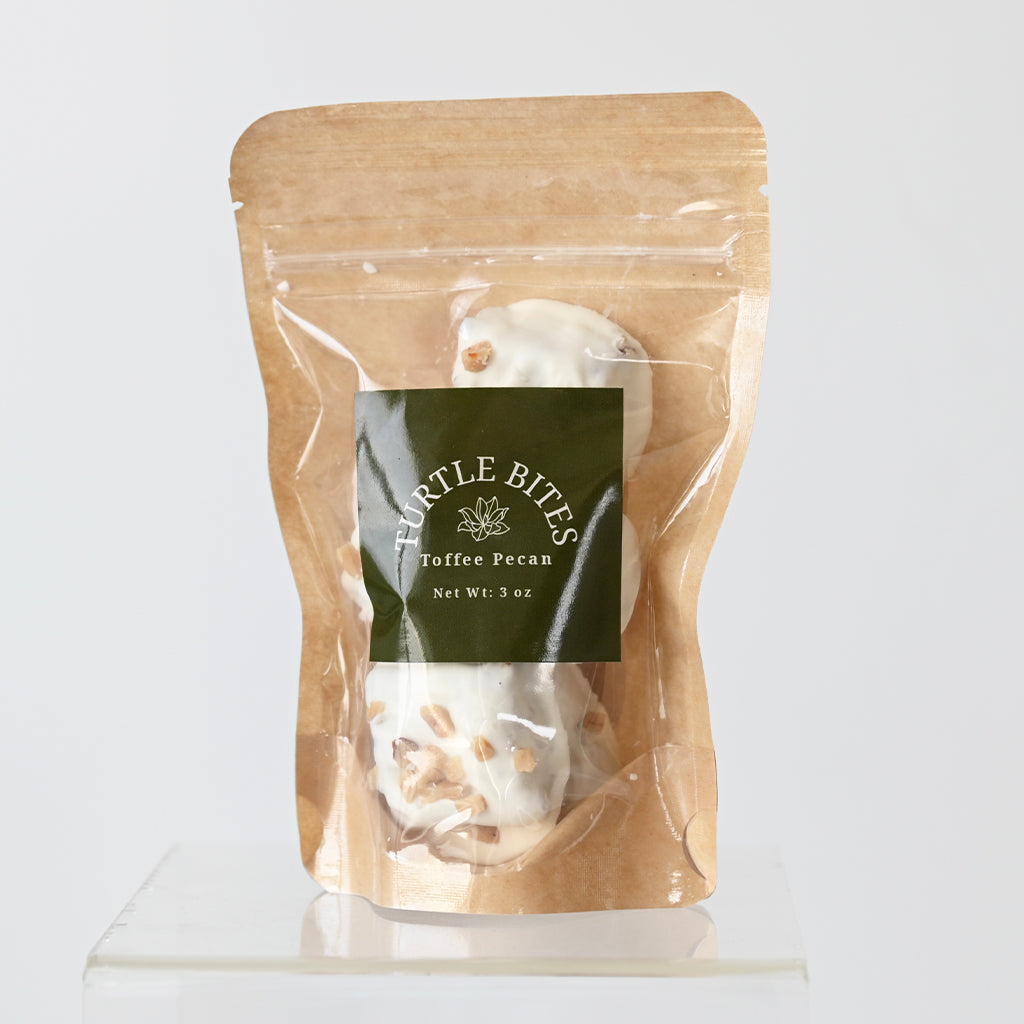 These delicious pecan turtle bites are a smaller version of the best selling pecan turtle. Toasted pecans are mixed with caramel then dipped in white chocolate and topped with crunchy toffee bits. 3 ounces