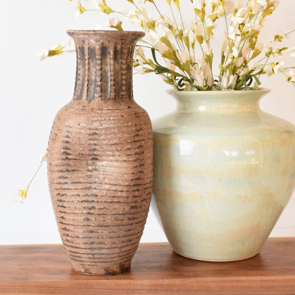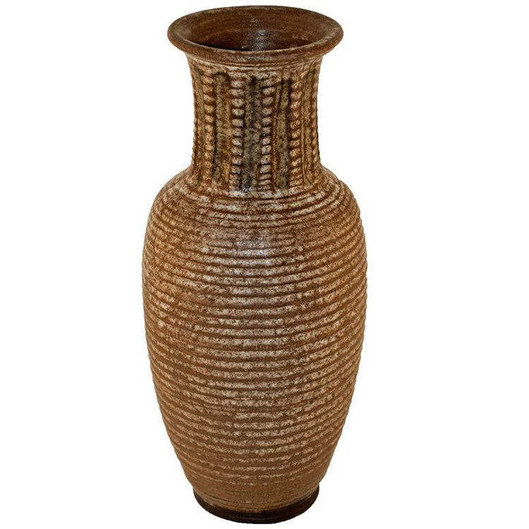 This 12" vase is crafted by Woods Brothers of Mound Bayou, featuring a nutmeg glaze for a stunning, high-end look. A true statement piece, the rustic hand-made finish brings a unique warmth and charm to any décor.