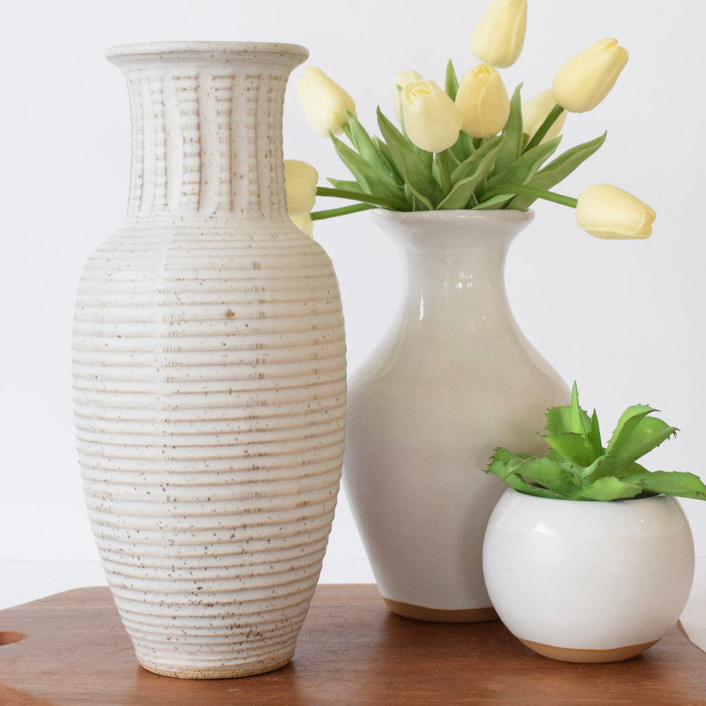 Make a statement with the 12" Vase White from Woods Brothers of Mound Bayou. Featuring a classic white glaze finish, this decorative vase measures in at 12", making it perfect for displaying your favorite floral arrangements. Show off your unique taste and add a touch of classic style to your home.