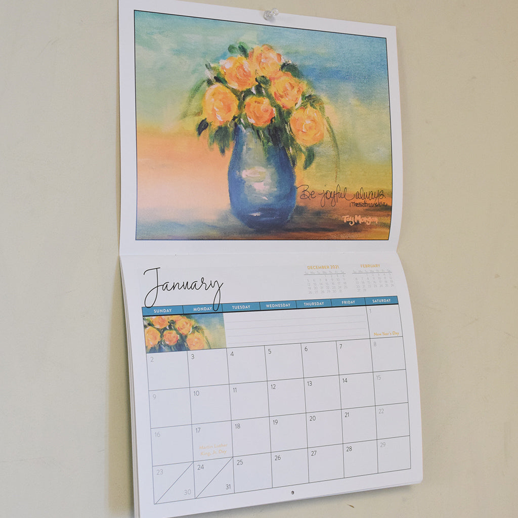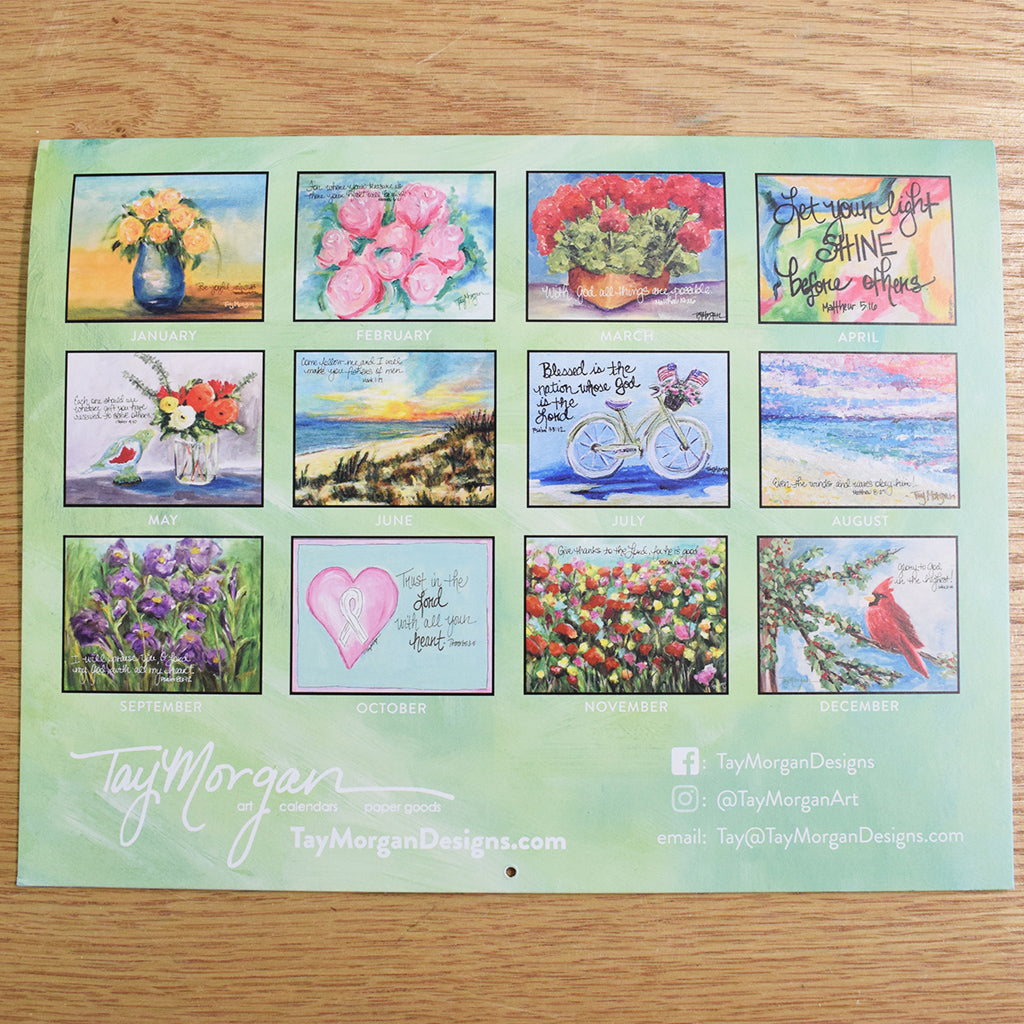 Tay Morgan's inspirational calendar is designed and printed with new illustrations each year! Every month features a special Bible verse together with unique and charming designs. The prints from the calendar also look great framed! Size: 8 1/2 x 11 (17 x 11 when opened) Calendar includes a hole in top for convenient hanging and a blank page in front for notes and important phone numbers.