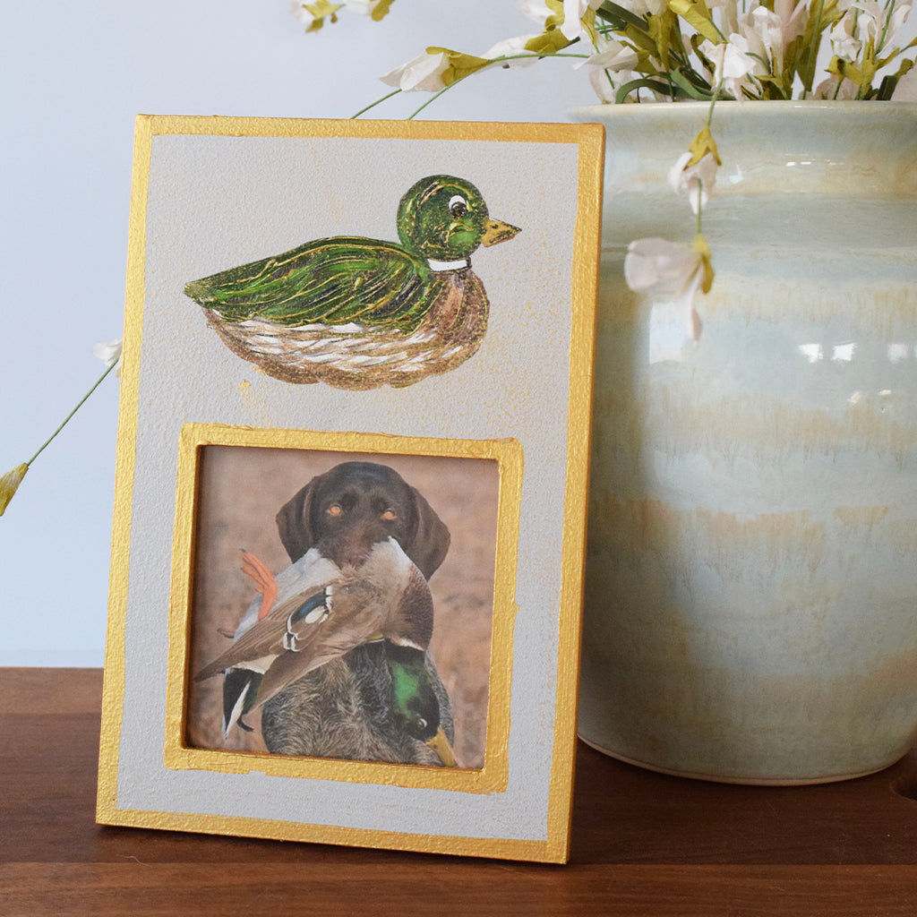 Showcase your favorite moments with this hand painted Mallard Duck picture frame. Crafted with a 4"x 4" opening, the frame measures 9"x 6" and will be a unique addition to any room. The perfect gift for any bird enthusiast.