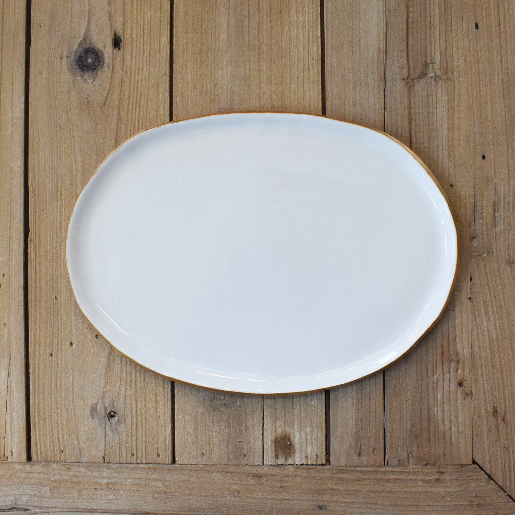 The simplicity of these beautiful oval platters will compliment almost any home decor. With a glossy stark white glaze & matte gold rim - they are classically gorgeous! Pair them with a matching vase, use as a serving piece for a small appetizer, or display it on an easel in your bookcase - the versatility is endless!