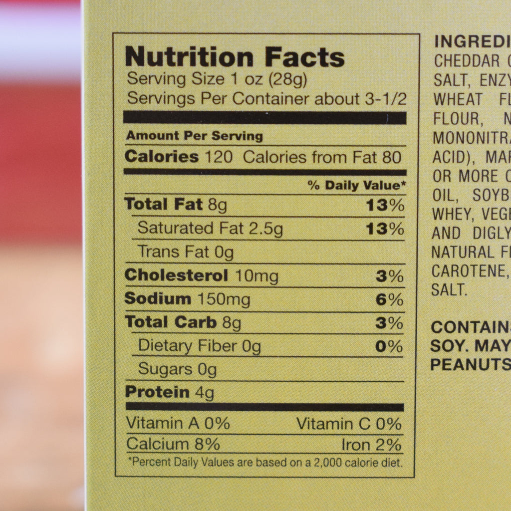 Ingredients: Asiago and Cheddar Cheeses, Flour, Margarine, Water, Salt, Citric Acid, Beta Carotene, Vitamin A Palmate, Whey, Salt.