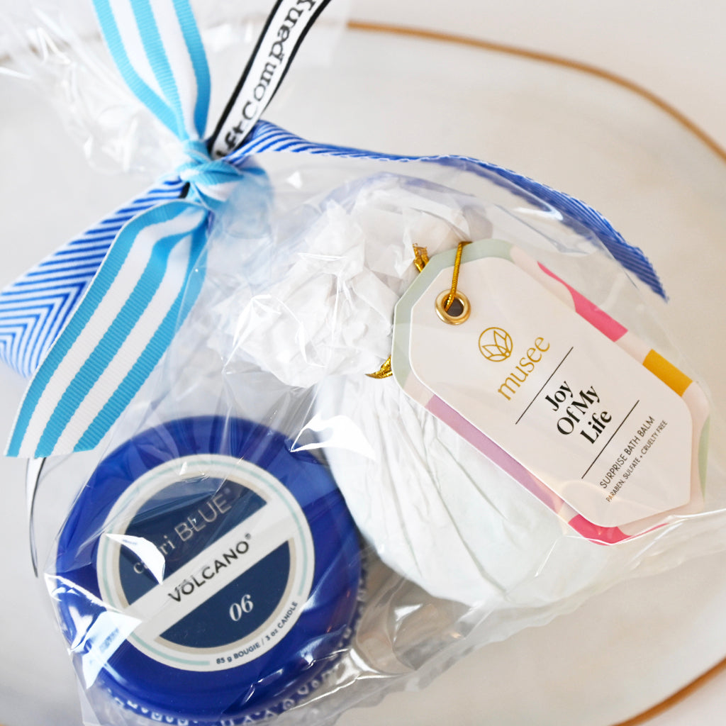 Your ticket to a relaxing experience! This gift set includes a heavenly-scented bath bomb and a mini candle to light while you're enjoying your bath. Perfect birthday or teacher happy! Unwind in a luxurious aroma and pamper yourself with a long, fragrant soak.