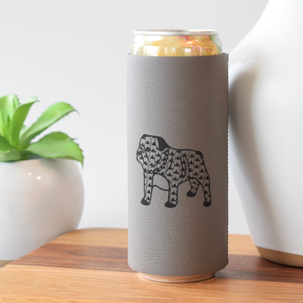 Impress your friends with this premium leather coolie featuring a patterned bulldog print. Keep your slim cans cold and your style on point with this high-quality full-grain leather construction. Perfect for tailgating or any occasion, this coolie is a must-have for any passionate beverage enthusiast.