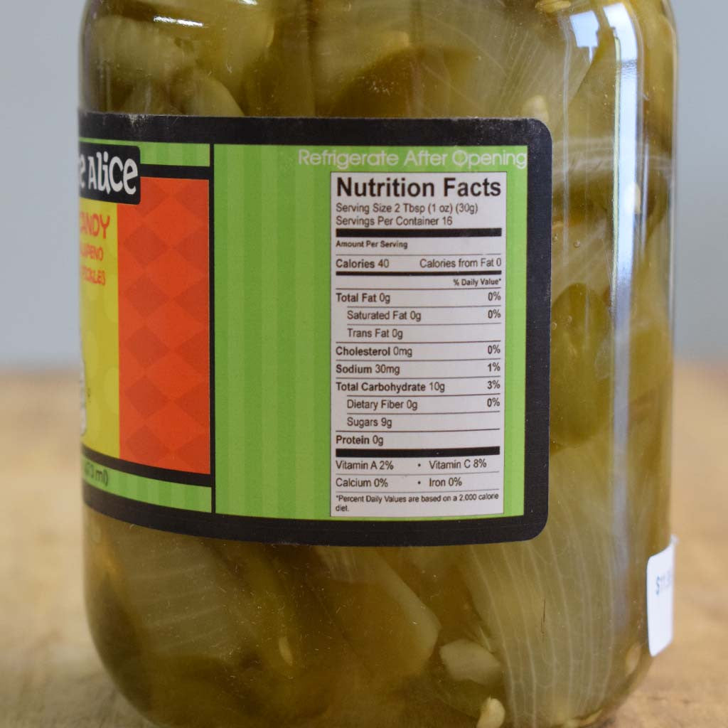Ingredients: jalapeño peppers, sugar, onions, water, vinegar, salt, citric acid, erythorbic acid (to maintain color)