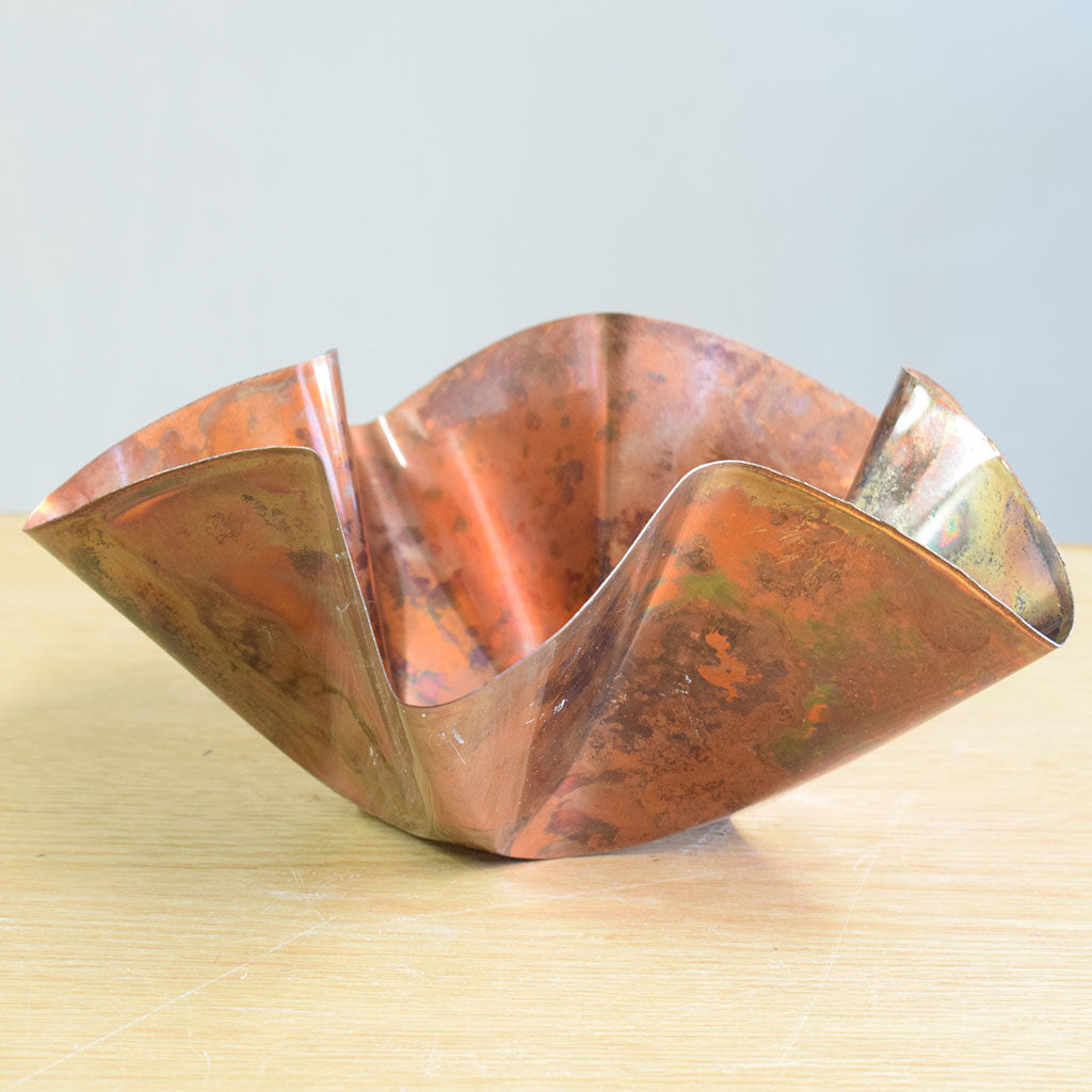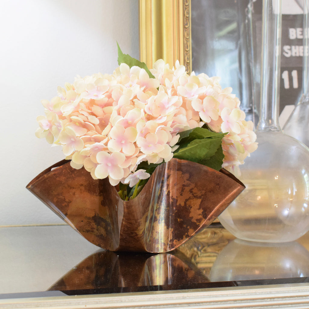 This copper flower pot is a beautiful piece for the garden, patio, or even the living room. This flower pot is 10"x 8" and is 4" deep and can hold three small pots or one large mass of soil and flowers. Available in three classic finishes.