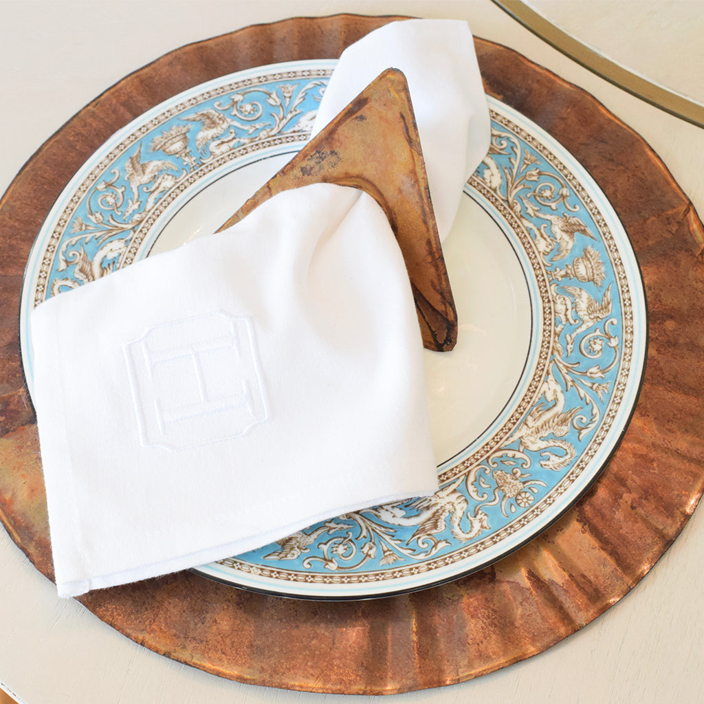 This copper charger would make a beautiful addition to your tablescape! Measuring 13.5", this charger will dress up any place setting, whether formal or casual. The charger is paired here with the copper delta napkin rings and monogrammed initial dinner napkins.