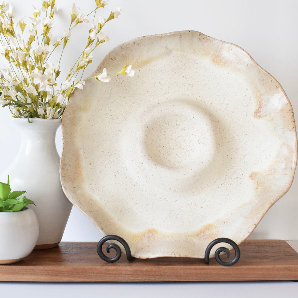 Each unique piece of Etta B Pottery is handcrafted and meticulously hand painted. The beautiful glazes provide a color palate sure to coordinate with any décor. The distressed and antique accents on these exquisite textures makes each piece a treasure. Though similar, no two pieces are just alike. Measures 16" in diameter.