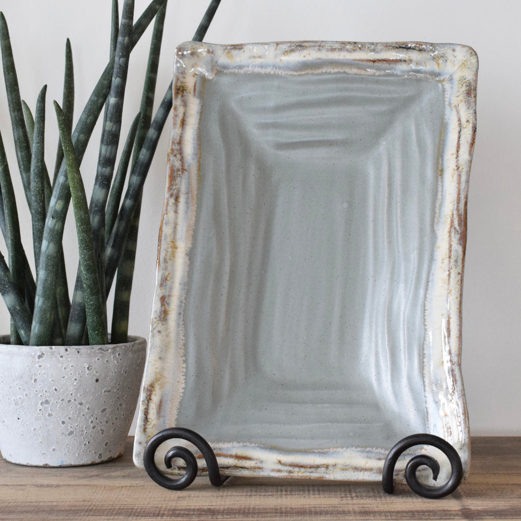 Each unique piece of Etta B Pottery is handcrafted and meticulously hand painted. The beautiful glazes provide a color palate sure to coordinate with any decor. The distressed and antique accents on these exquisite textures makes each piece a treasure. Though similar, no two pieces are just alike. This particular piece measures 14"x 9.5".