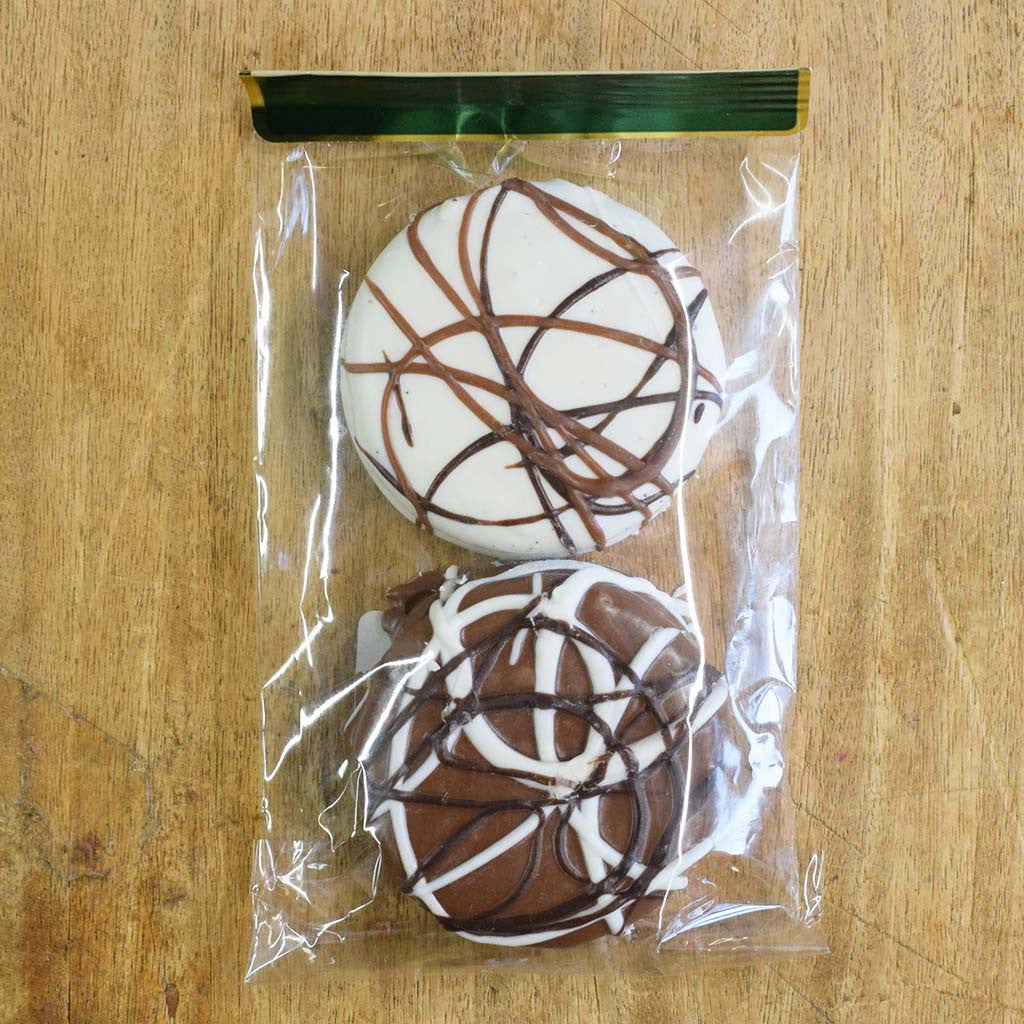 Two Pack oreo hand dipped with white chocolate and sprinkled with holiday sprinkles for a festive snack. Makes a great addition to a basket!