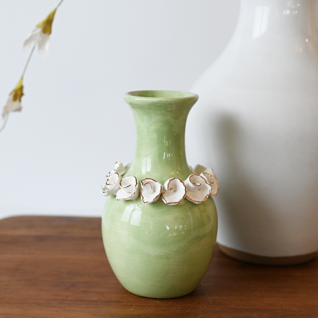 Introducing the exquisite Floral Bud Vase in stunning green. This hand painted masterpiece stands at 5" tall, adding a touch of elegance to any room. Bring the beauty of nature indoors with this luxurious piece, perfect for displaying your favorite blooms.
