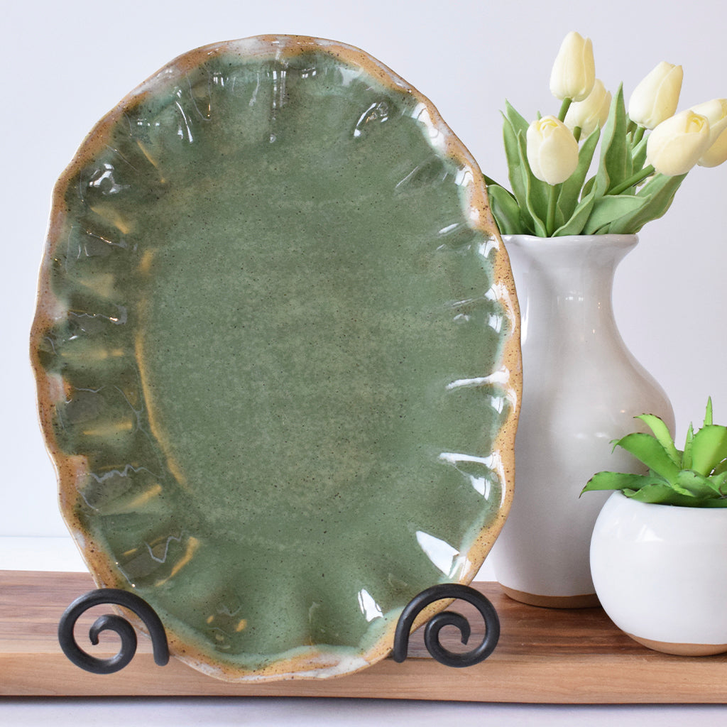 Serve up some style with our Fluttered Oval Platter in Matcha Leaf. Its uniquely designed edges add a touch of flair to any entertaining setting. And with its dishwasher and oven safe features, you'll have a worry-free clean up.