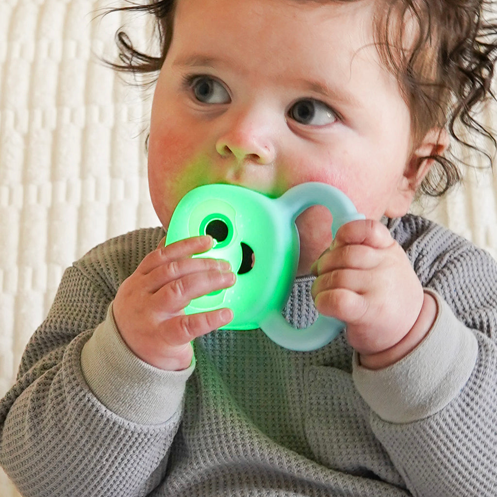 Brand new and created just for you, little ones! The Glo Light-Up Rattle is designed to light up little minds and foster sensory development from the very first shake. An easy-to-hold handle grippy handle invites babies to reach and grasp, refining developing fine motor skills. The Light-Up Rattle magically lights up when gently shaken, providing instant visual feedback. Batteries included.