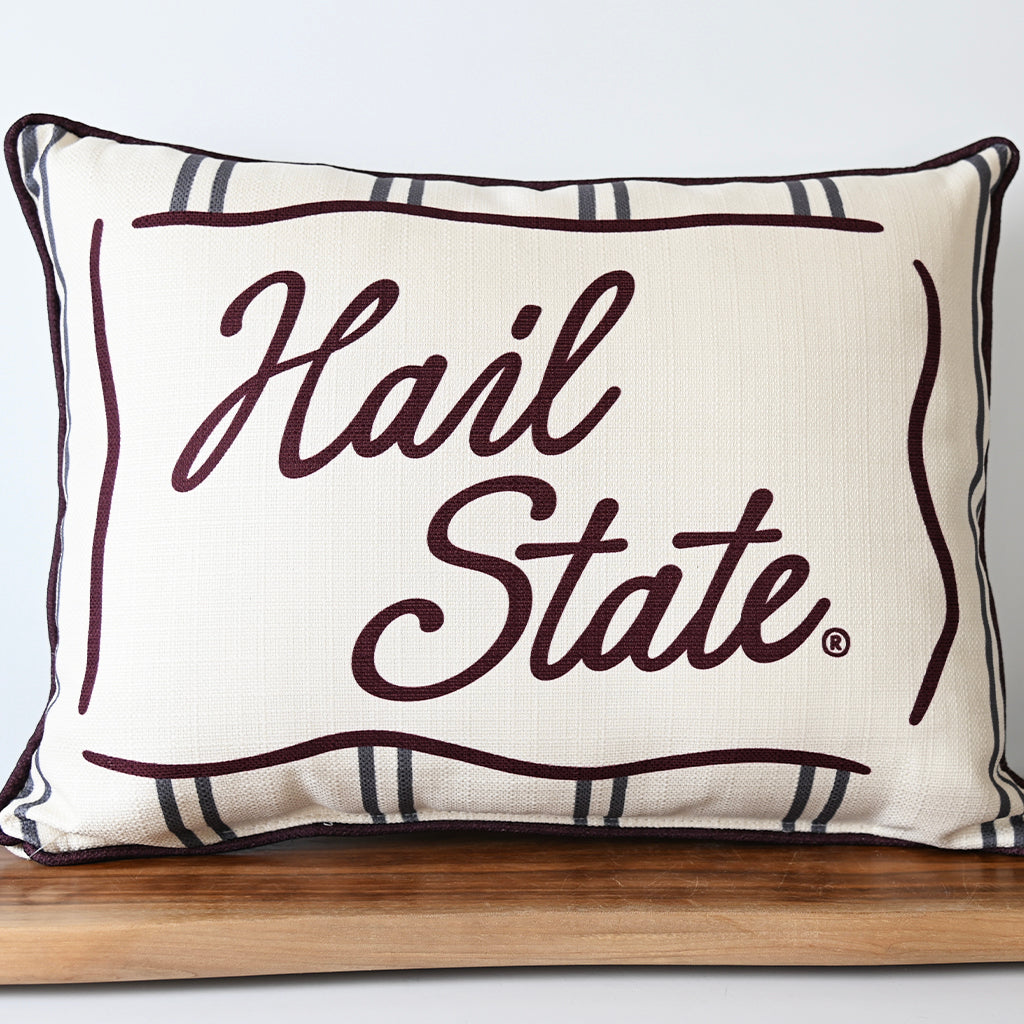Get ready to cheer on the Bulldogs with this Hail State Stripe Rectangle Pillow! Perfect for any Mississippi State fan, this pillow features the iconic phrase "Hail State" Let your team spirit shine while adding some flair to your home decor. Go Dawgs!