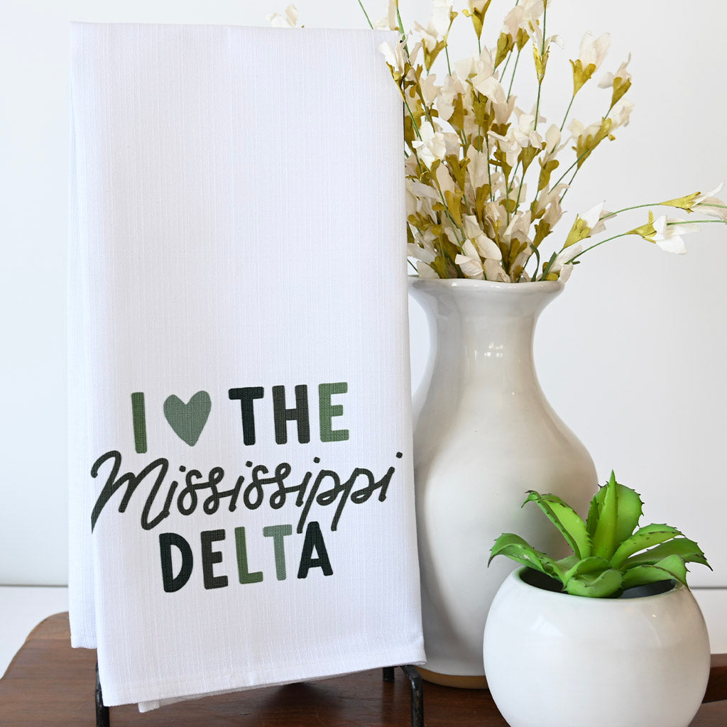 Show your love for the Mississippi Delta with this 'I Love the Delta' Hand Towel! Featuring unique green tones, this towel will easily complement any decor. Grab yours today and add a touch of Delta to your home!