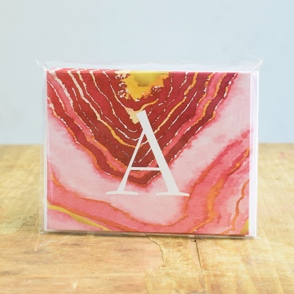Experience the stunning blend of pink and gold in our handcrafted Initial Agate Pink Notecard Set! Perfect for sending thank yous or words of comfort, each set includes 8 note cards and 8 coordinating envelopes.