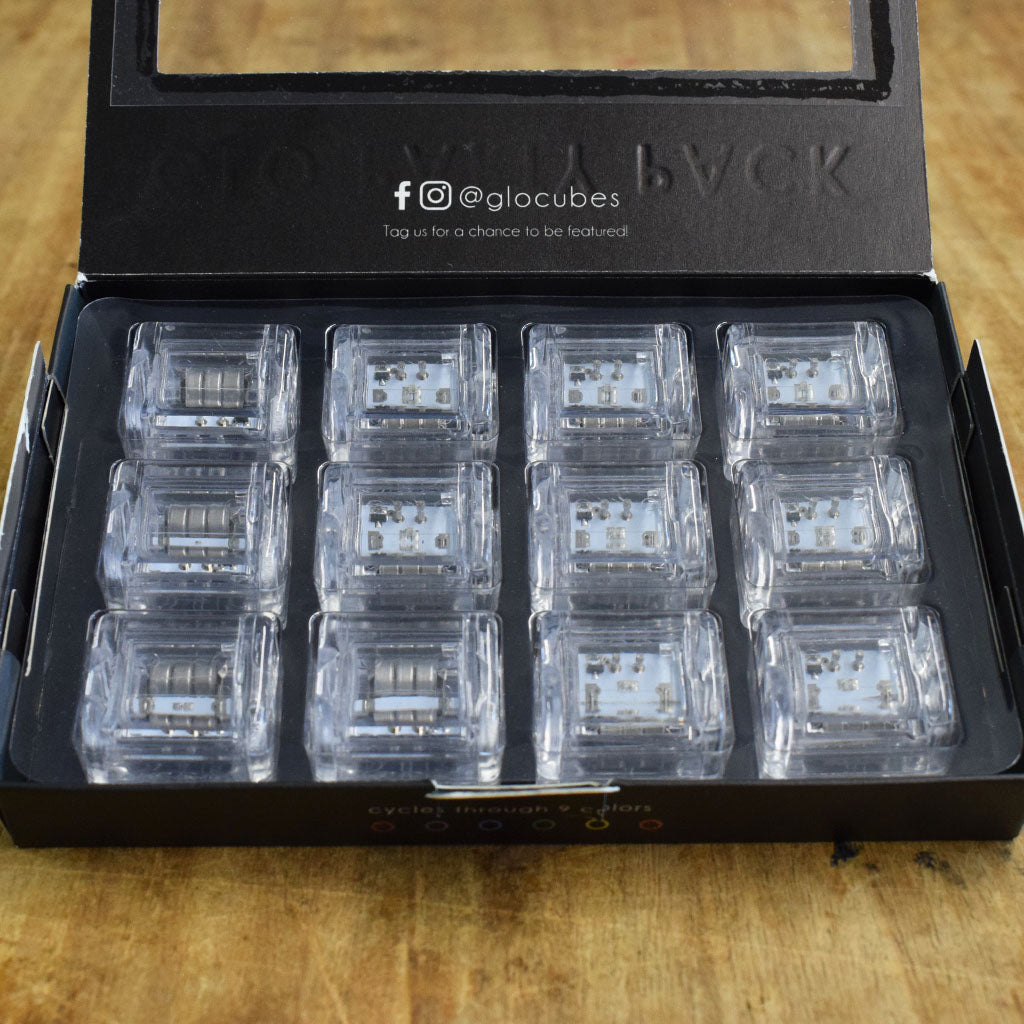What a hit at parties! Drop a glo-pack into any beverage and watch it light up your drink! Twelve cubes in every pack. Cycles through nine colors.