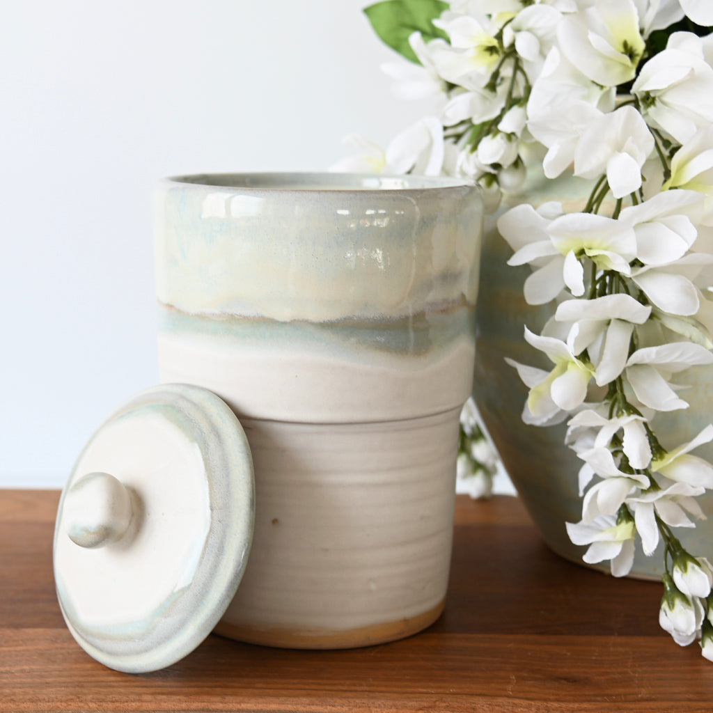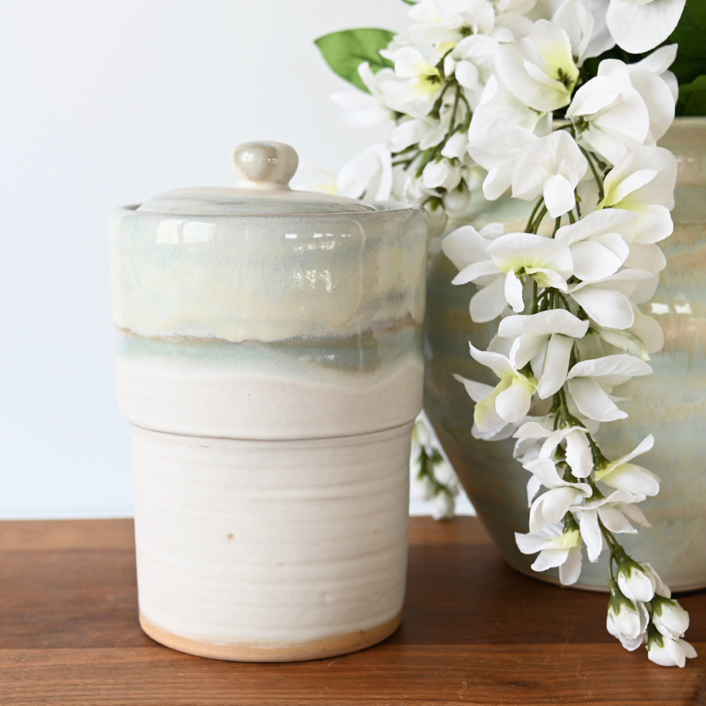 Elevate your storage with our Medium Canister in stunning Hydrangea glaze. Its beautiful finish not only adds a touch of elegance to your space but also keeps your tea or ingredients fresh and protected. Perfectly sized for everyday use, this canister combines style and function effortlessly. Make it a centerpiece in your kitchen and enjoy the perfect blend of beauty and practicality every day.