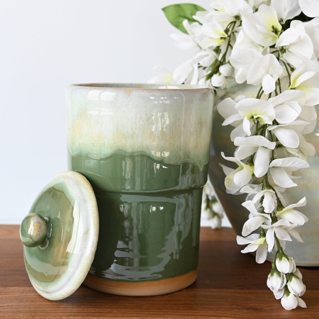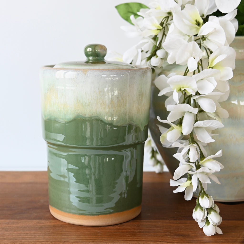 Elevate your storage with our Medium Canister in stunning Matcha Leaf glaze. Its beautiful finish not only adds a touch of elegance to your space but also keeps your tea or ingredients fresh and protected. Perfectly sized for everyday use, this canister combines style and function effortlessly. Make it a centerpiece in your kitchen and enjoy the perfect blend of beauty and practicality every day.