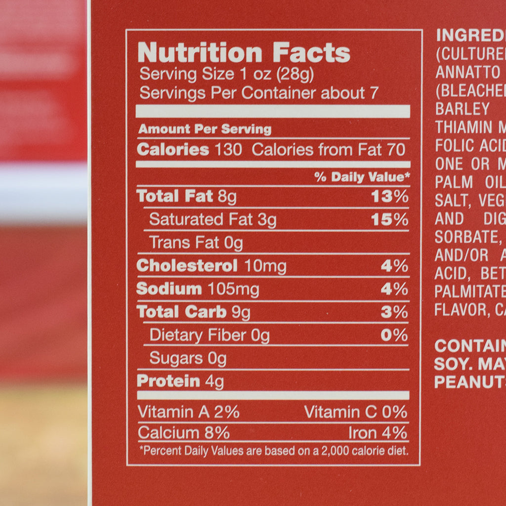 Ingredients: Cheddar Cheese, Flour, Margarine, Natural and Artificial Flavor, Water, Salt, Citric Acid, Beta Carotene, Vitamin A Palmate, Whey, Salt, Natural Flavor, Cayenne Pepper.