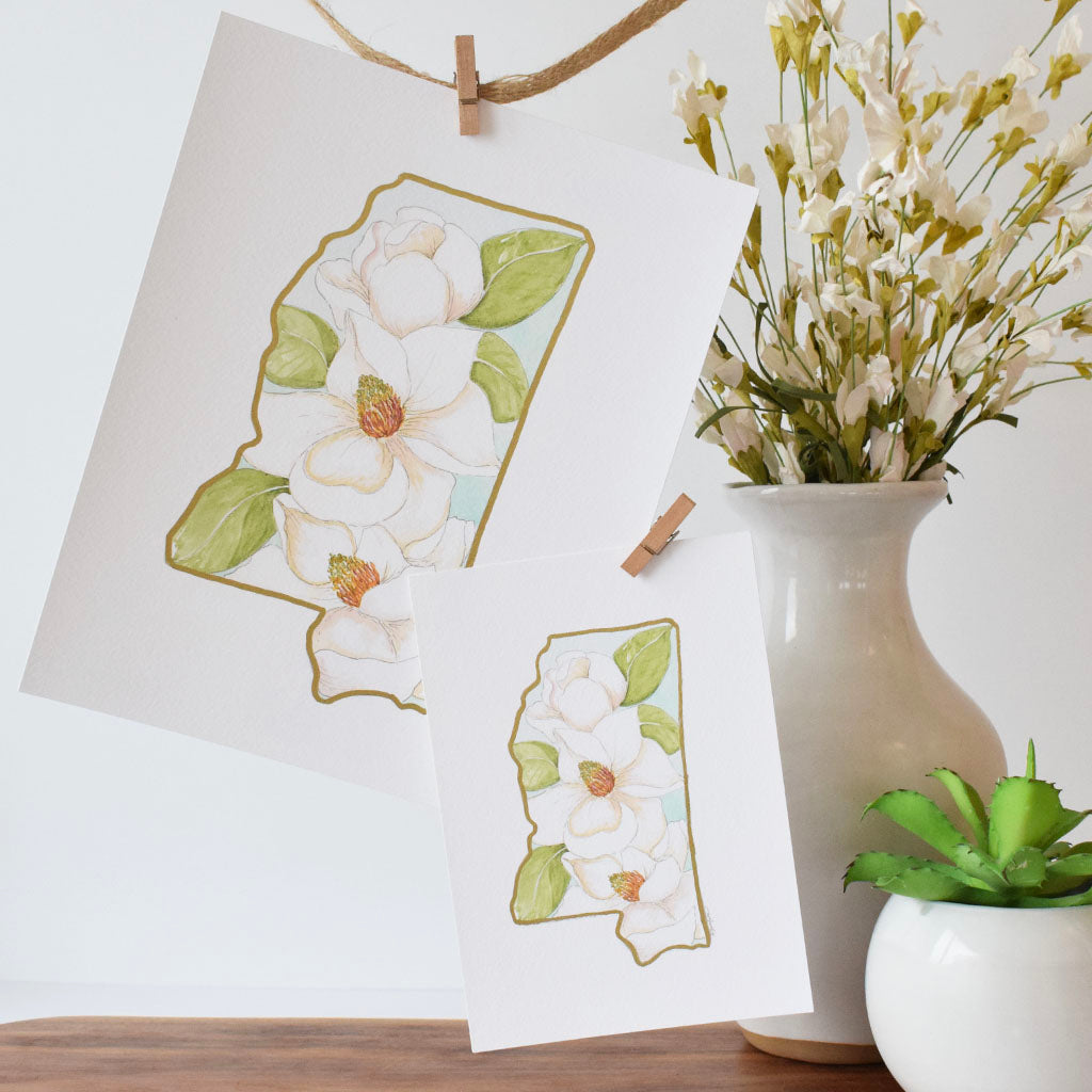 Experience the beauty of Mississippi with our Magnolia Blossoms Print, featuring the stunning artwork of artist Mandy Burnham. Printed on high-quality watercolor paper and hand-embellished with gold paints, this piece will add elegance to any room. Available in two sizes, 5x7 and 8x10. Print comes unframed.