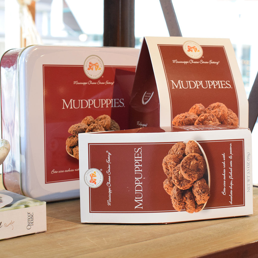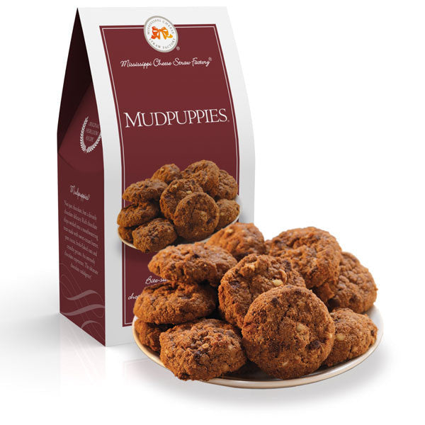 Chock full of fine chocolate chips, sweet cream butter, pure cocoa, flaked oats and pecans, Mississippi MudPuppies are as rich as the Mississippi mud inspiring their name. They are a direct descendant of the recipe created by the Delta matron who whipped up batches to silence her rambunctious youngsters. Word spread and soon her cookies were the favorites of bake sales, church bazaars and town fairs. So go