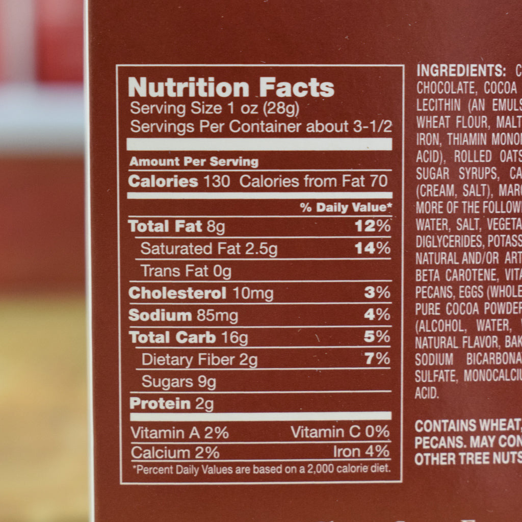 Ingredients: Chocolate Chips, Flour, Rolled Oats, Brown Sugar, Sugar, Butter, Margarine, Pecans, Eggs, Natural Flavor, Baking Powder, Ascorbic Acid.