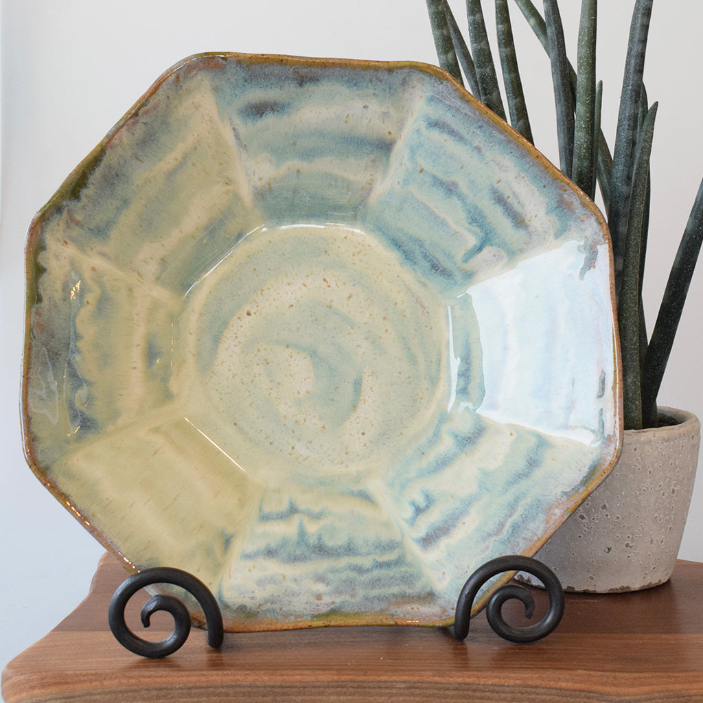Serve up something delicious with this stylish octagonal bowl! This pottery bowl is the perfect mix of style and function - the blue and green glaze is sure to add a splash of color and personality to your table. When filled with your favorite side dish, it'll be the talk of the dinner party!