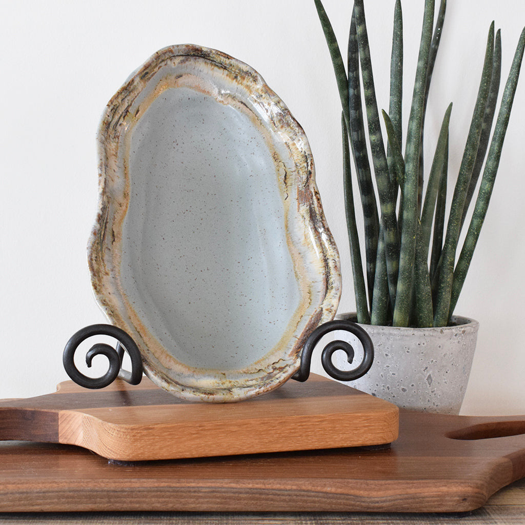 Each unique piece of Etta B Pottery is handcrafted and meticulously hand painted. This beautiful glaze is sure to coordinate with any décor. This versatile piece is the perfect size for an appetizer, desserts, or cheese tray & would make the perfect display piece, as well!
