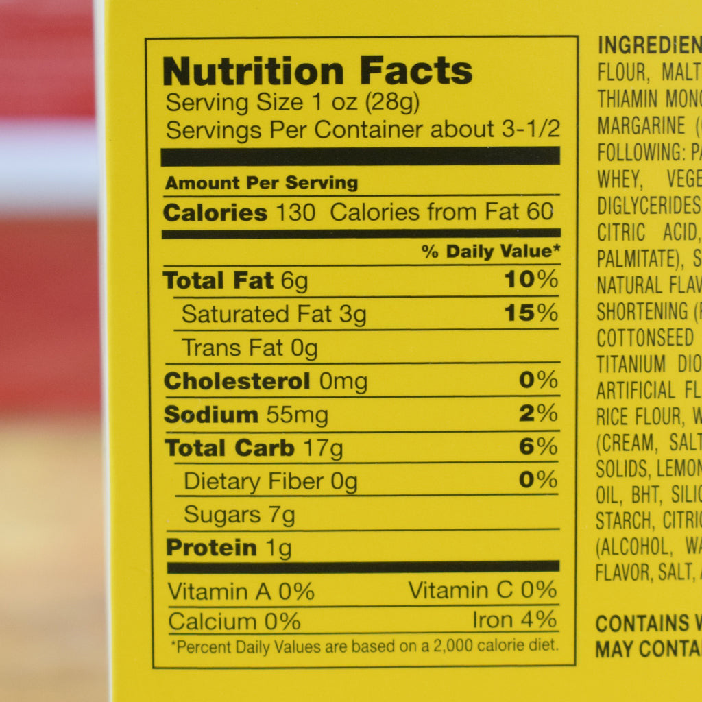 Ingredients: Flour, Margarine, Water, Salt, Natural and Artificial Flavor, Citric Acid, Beta Carotene, Vitamin A, Sugar, Sugar Coating, Lemon Juice Solids, Lemon Flavor, Lemon Oil, Corn Starch, Natural Lemon Extract, Ascorbic Acid