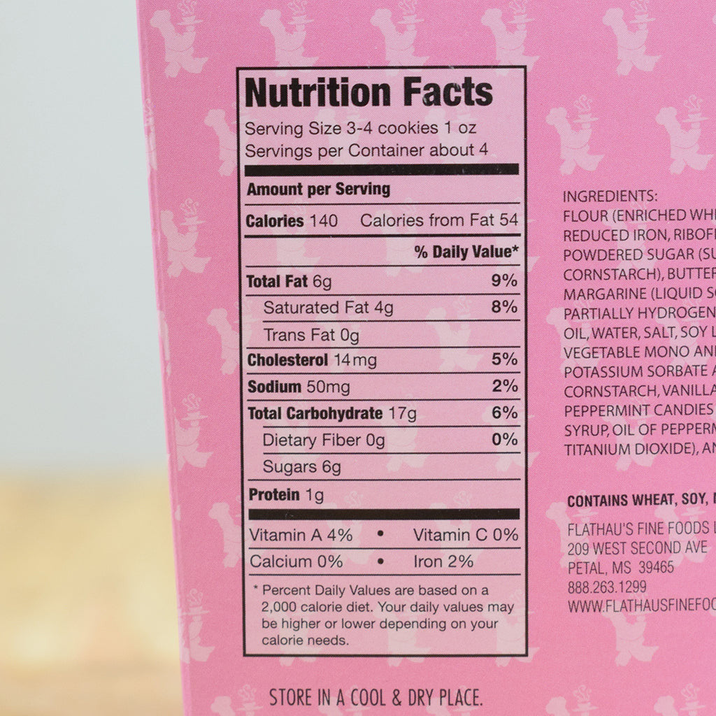 Ingredients: Flour, Powdered Sugar, Butter, Margarine, Water, Salt, Vanilla, All Natural Peppermint Candies, Natural Peppermint Flavor, Salt.