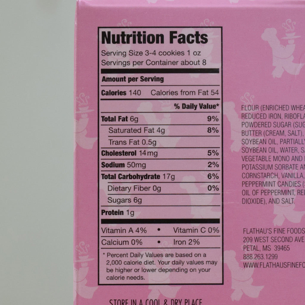 Ingredients: Flour, Powdered Sugar, Butter, Margarine, Water, Salt, Vanilla, All Natural Peppermint Candies, Natural Peppermint Flavor, Salt.
